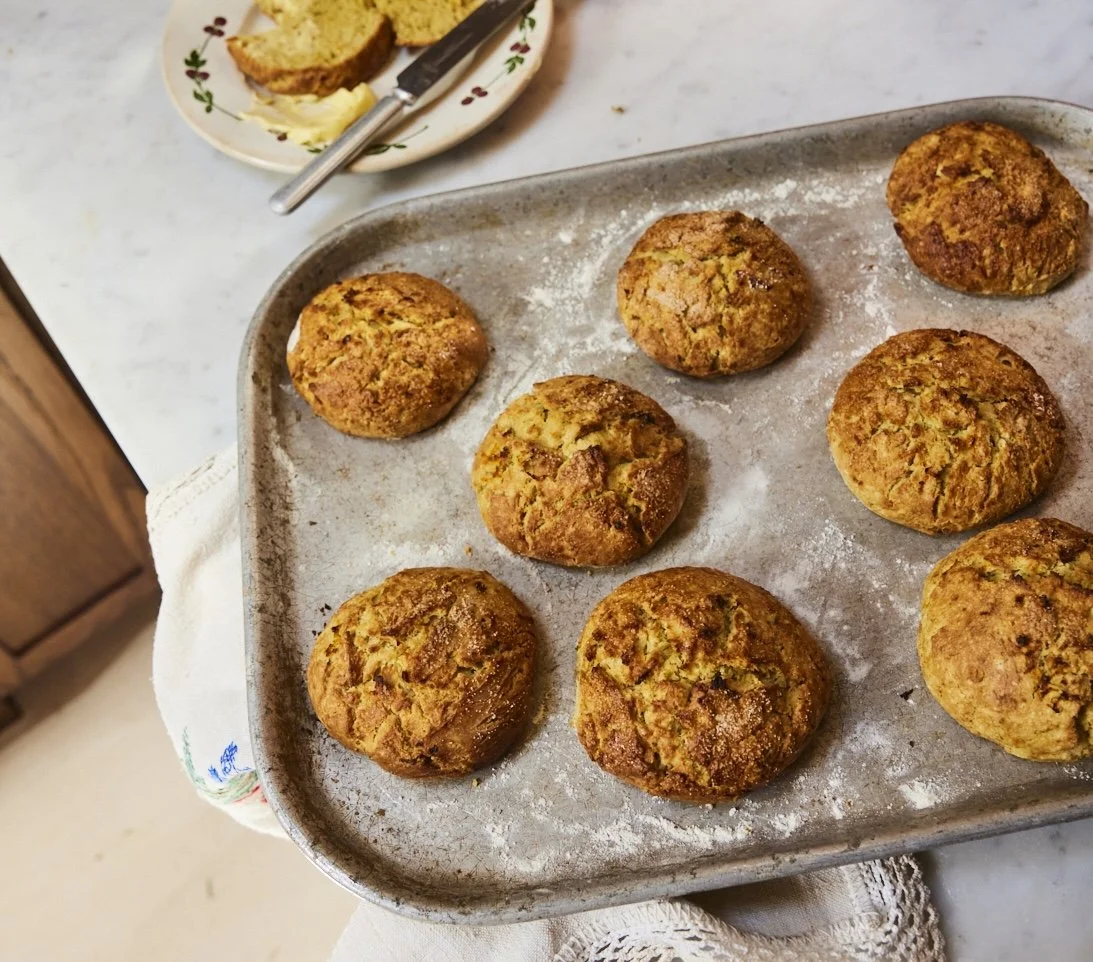 Roll out the dough on a floured surface to a thickness of 1cm (1/2in). Cut into circles with a pastry cutter or an upturned glass. Brush the scones with the remaining milk and a sprinkle of sugar, and zest of orange. Place the circles on a floured baking tray.