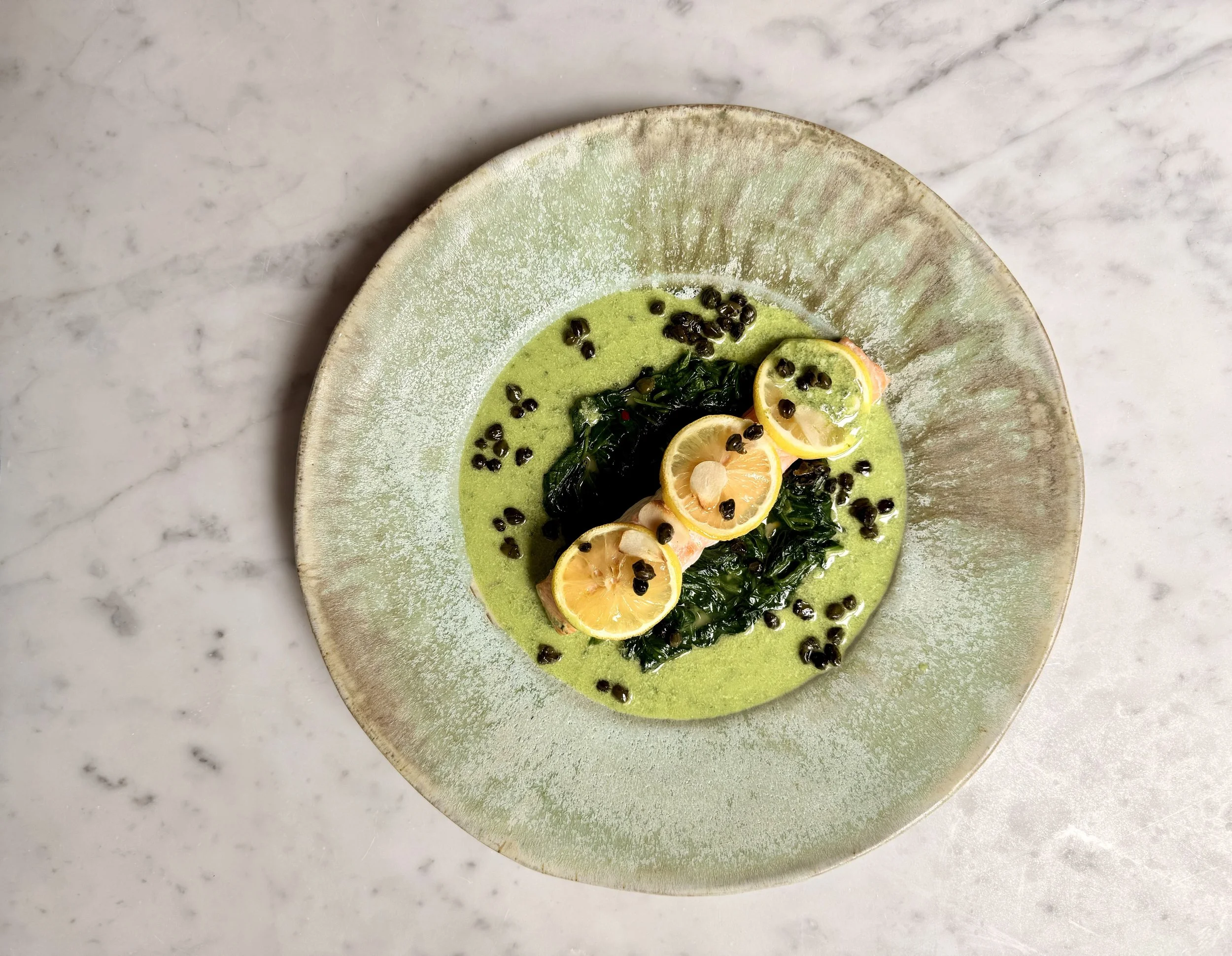 When the salmon is ready, remove it from the oven. To plate, divide the spinach between the two plates, and place the salmon on top. Drizzle the fresh herby sauce around the salmon, sprinkle over the capers, and serve with an extra lemon wedge.
