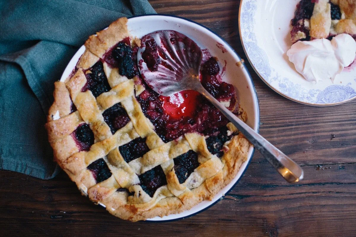 3. To make the pie, roll out 2/3 of the pastry so that it’s about 1/8 inch (3mm) thick, and line a 9inch flat plate. Trim the edges with a knife, pop into a fridge to chill again while you prepare the blackberries.
