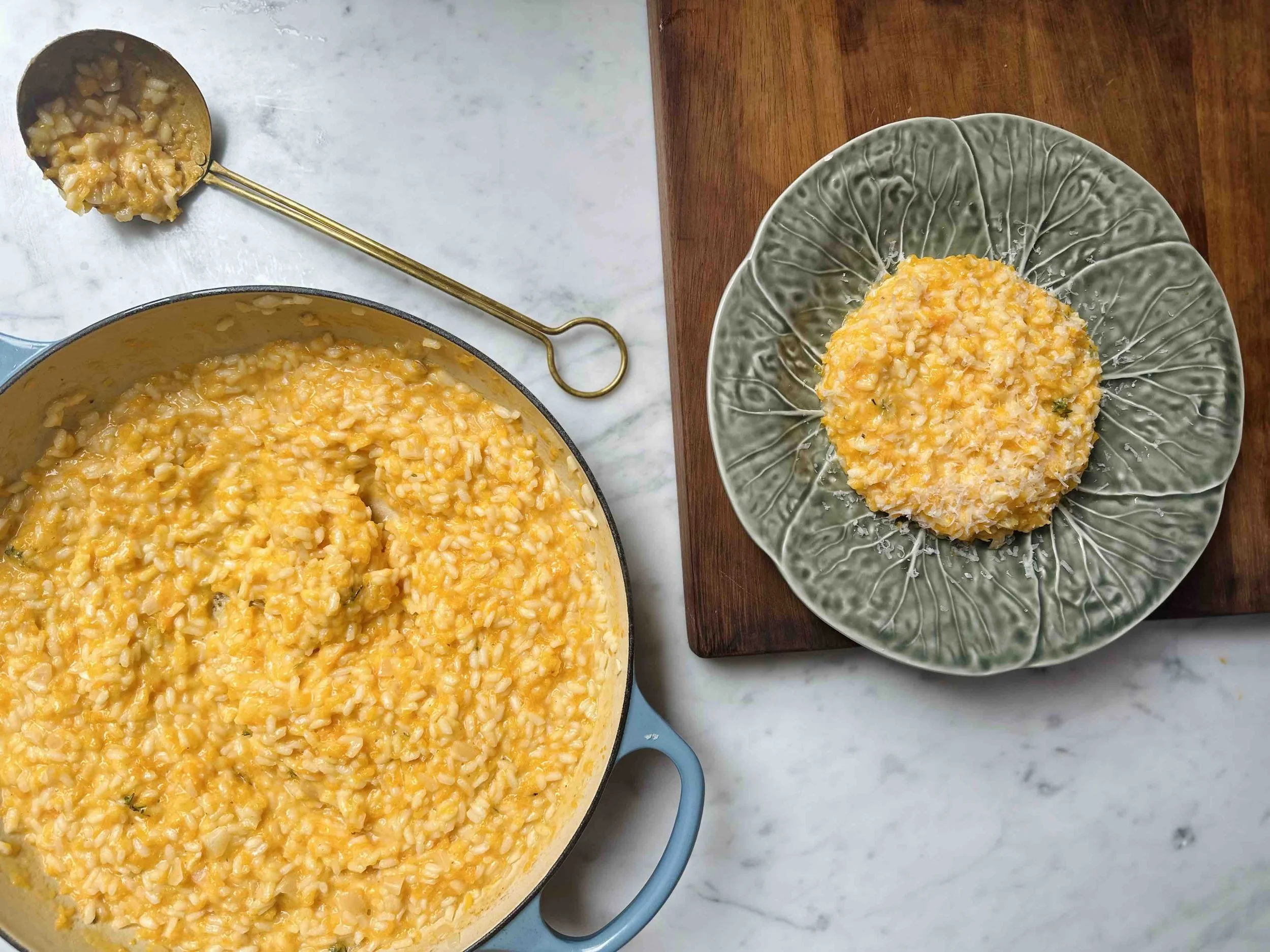 Stir the pureed butternut squash into the cooked risotto rice, and serve with grated parmesan cheese.