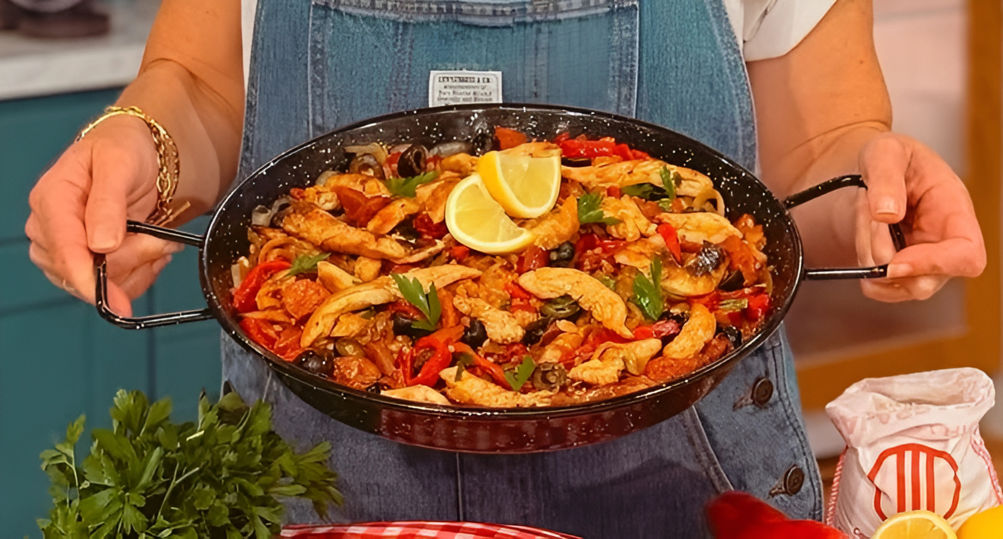 3. Pour in the rice and stir for a minute to gently toast, then pour in the chicken broth, juice from the lemon, smoked paprika, black olives, sliced red piquillo peppers, season with sea salt and freshly ground black pepper. Stir and return the chicken to the pan on top of the rice. Cover and cook for 20-25 minutes until liquid is absorbed, rice is tender, and chicken is cooked through.
