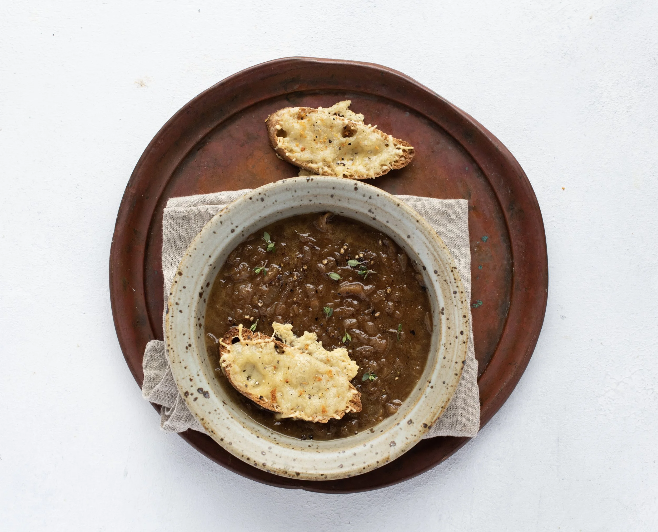 5. Serve the onion soup in heated bowls and place a cheese crouton on top of each soup.
