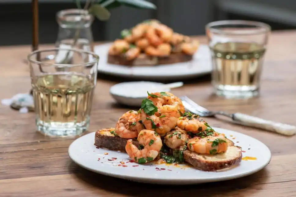3. Toast or griddle the sliced sourdough bread and place them on your serving dishes. Drizzle a little good-quality extra virgin olive oil over the toasts and spoon the prawns on top, scooping up all the juices from the pan to trickle over the dish.