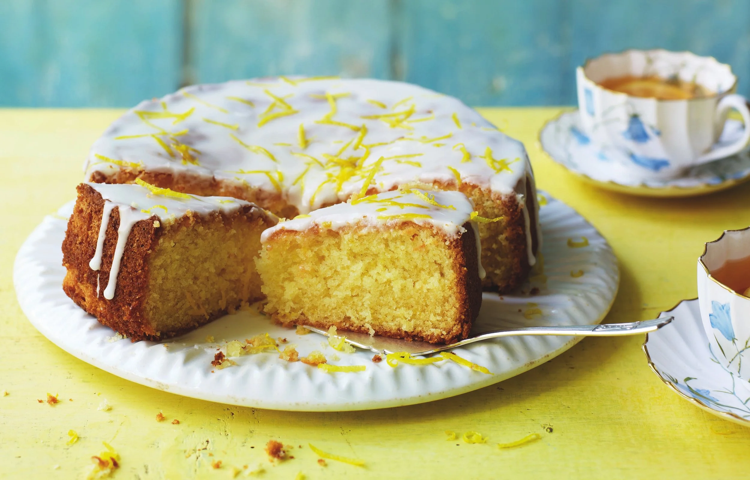 6. Make the drizzle. Whisk the lemon juice and icing sugar in a bowl until it forms a smooth paste. Remove the cake from the tin and smooth the lemon drizzle over the cake. Garnish with lemon zest.