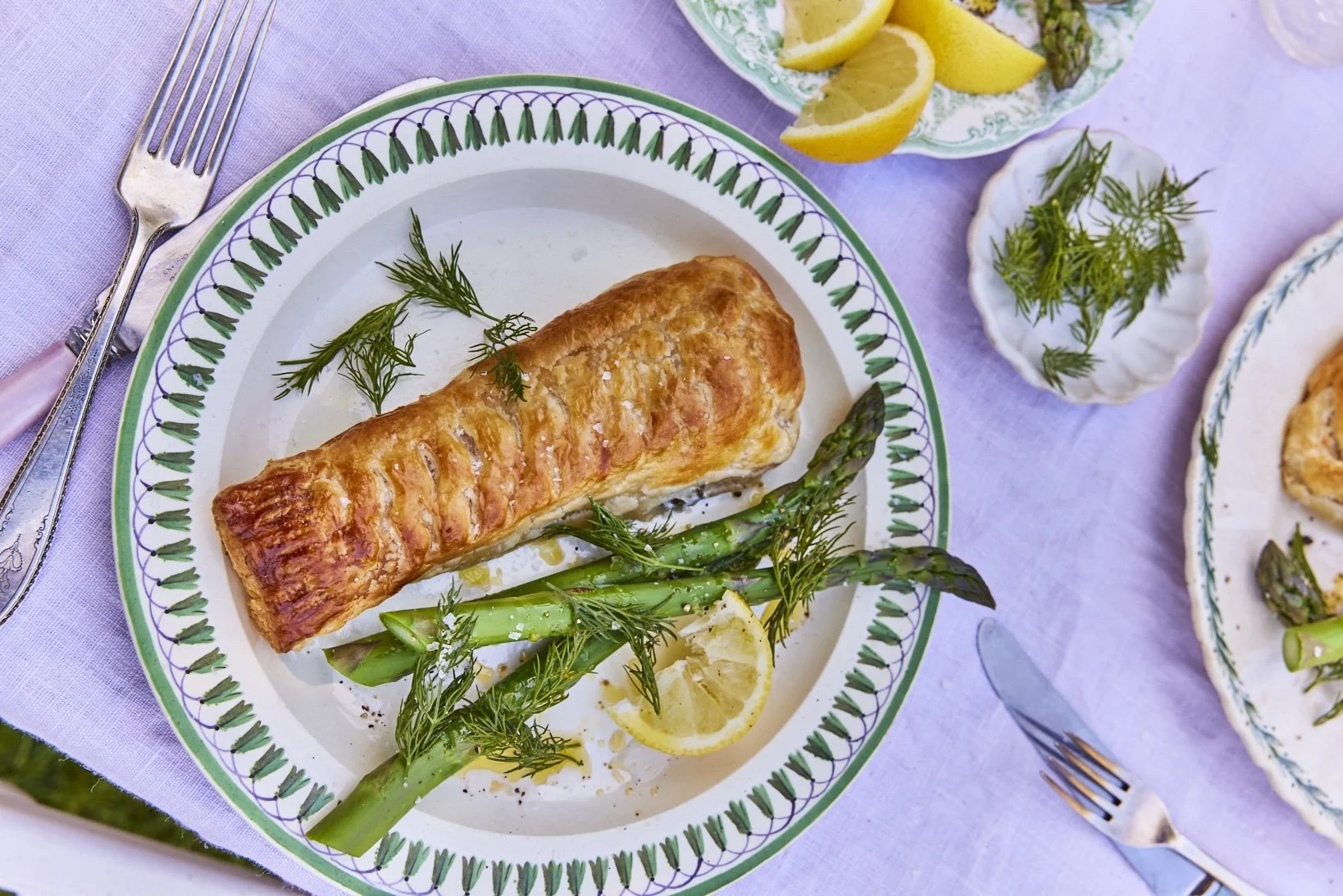 Serve each salmon en croûte parcel with asparagus and a drizzle of hollandaise and a wedge of lemon.