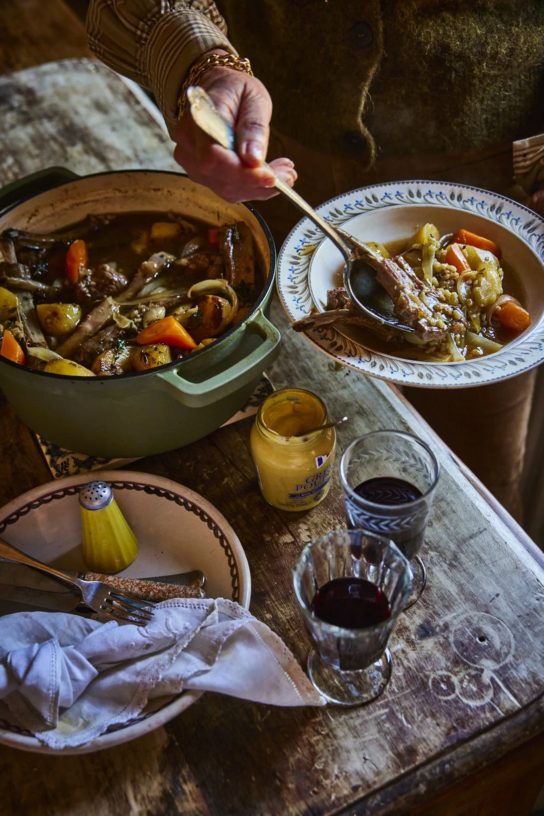 Place an ovenproof casserole dish over a medium heat and melt the butter. Next add the carrots, season with salt and pepper and stir until they are a nice golden colour. Remove to a plate and repeat the process with the onions, parsnips or turnips, potatoes and lamb cutlets.