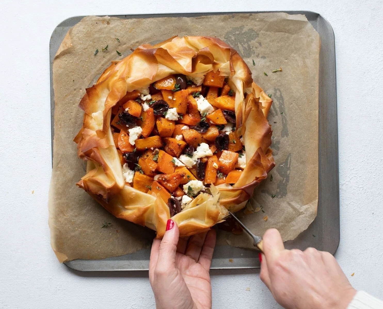 4. Arrange the roasted squash in center of the pastry, leaving 1½ inches of border uncovered. Sprinkle the filling with crumbled feta, thyme, chopped black olives and a drizzle of honey.