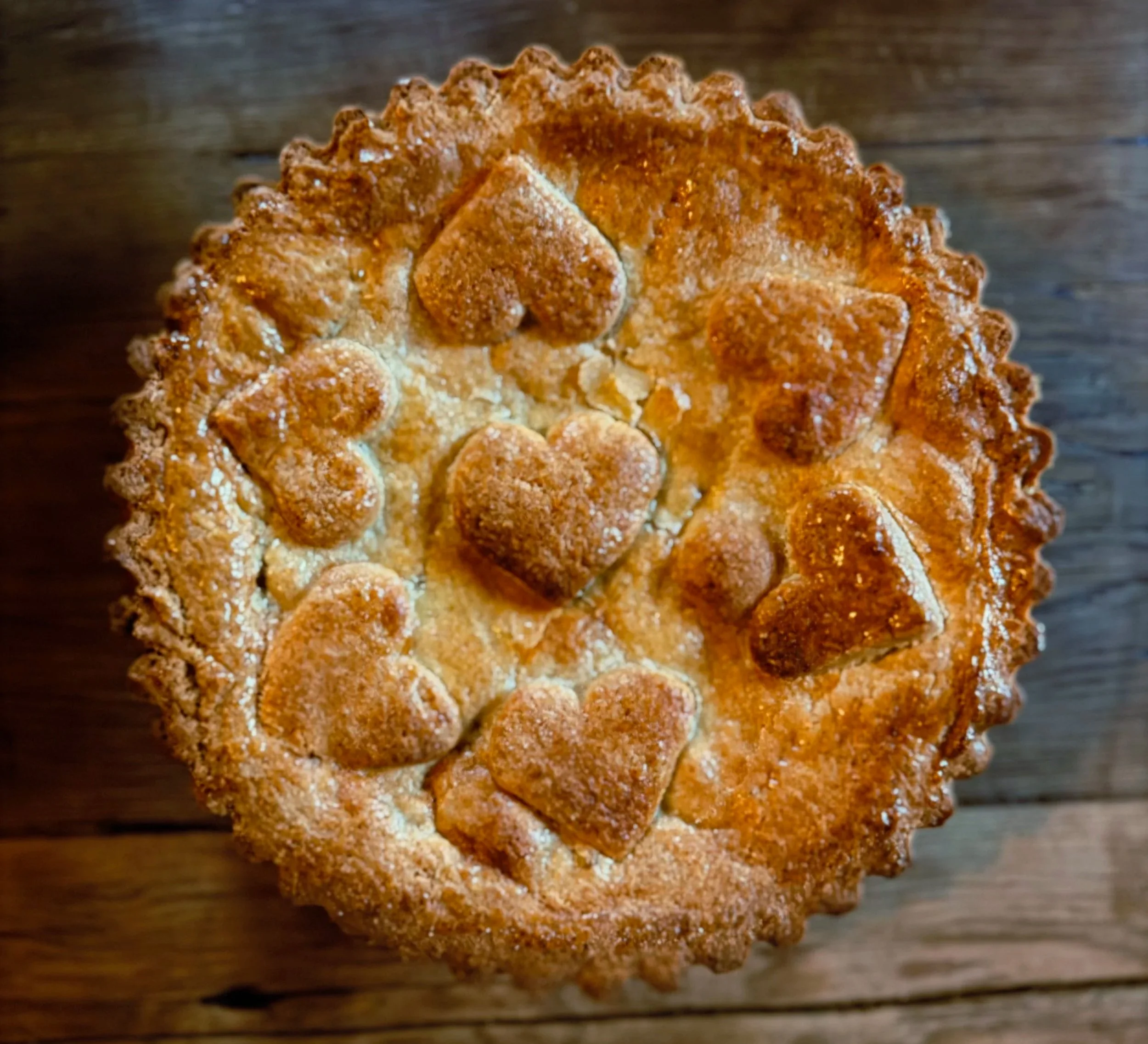 Next make the filling. Place the plums, sugar, cinnamon, ginger, cornflour and lemon into a mixing bowl and toss well. Spoon the filling into the pastry lined tin. Cover with a lid of pastry, seal edges and decorate with pastry hearts. Use a fork to create about 3-4 sets of air holes in the pastry lid.