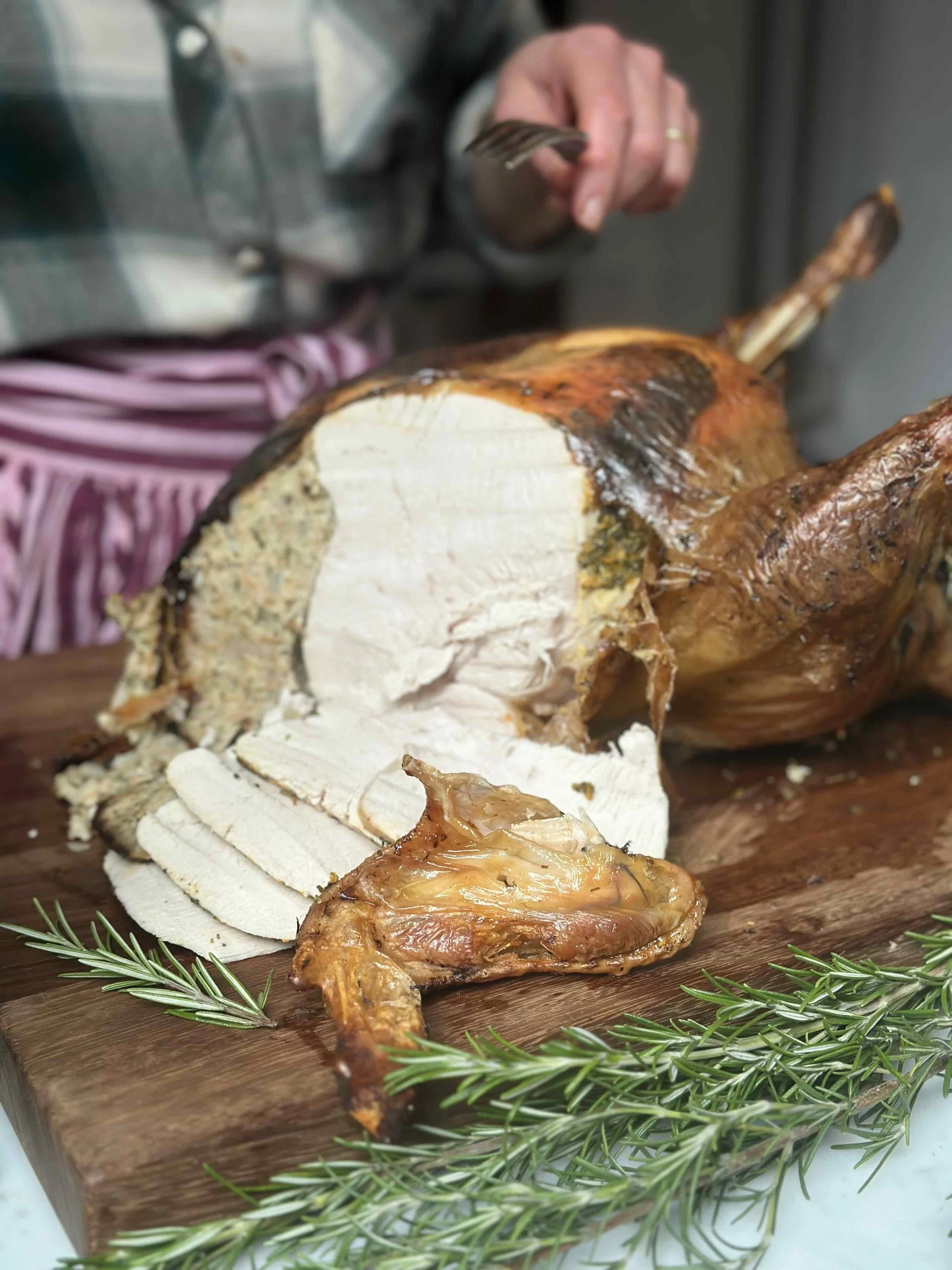 Make the stuffing by placing a saucepan over a medium heat and melting the butter. Then stir in the onions and apples and cover to sweat for two minutes. Then remove from the saucepan and allow to cool.