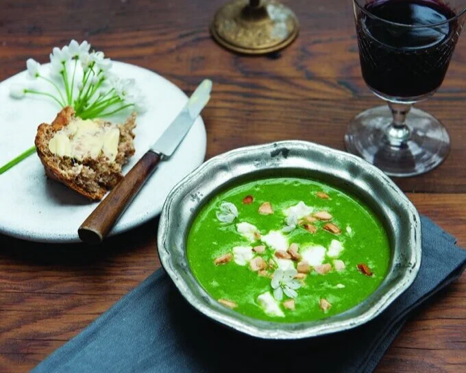 3. Place the chopped roasted almonds, sheep’s cheese and extra virgin olive oil in a small bowl and mix. Spoon on top of each serving of soup with a sprinkle of wild garlic flowers.