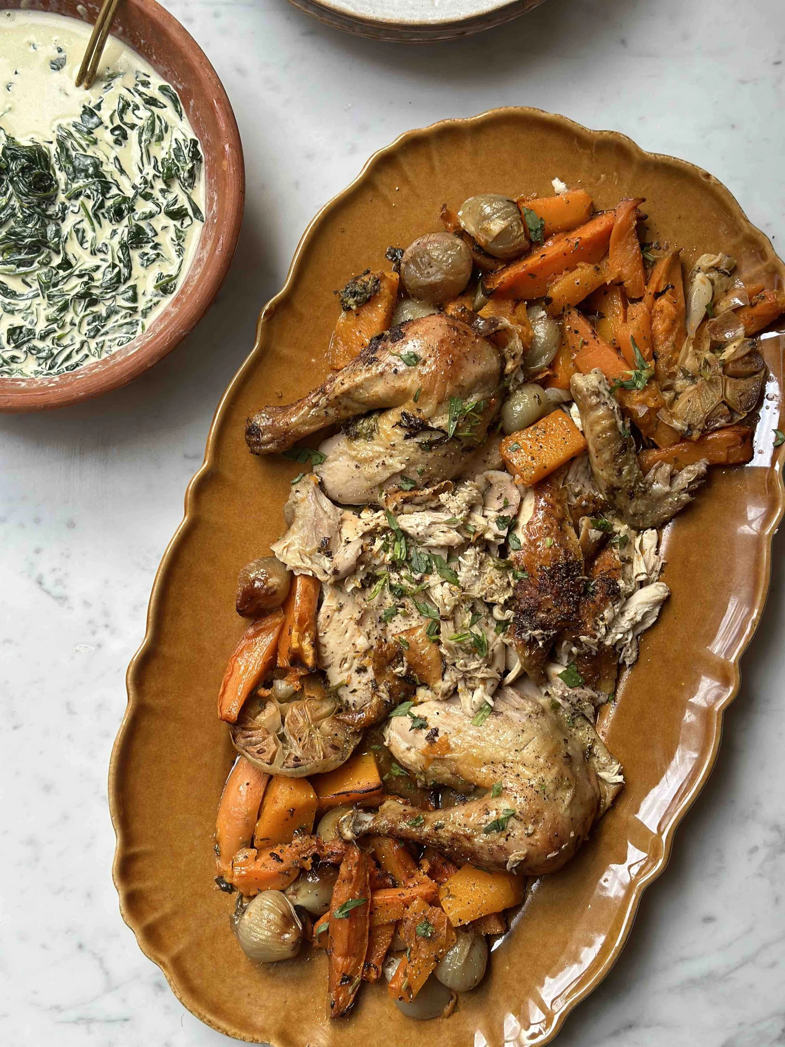 On Friday night I do a roast chicken basted in mustard tarragon butter with roasted sweet potatoes and butternut squash, served with creamed spinach. Get the recipe here and you can watch me make this here.